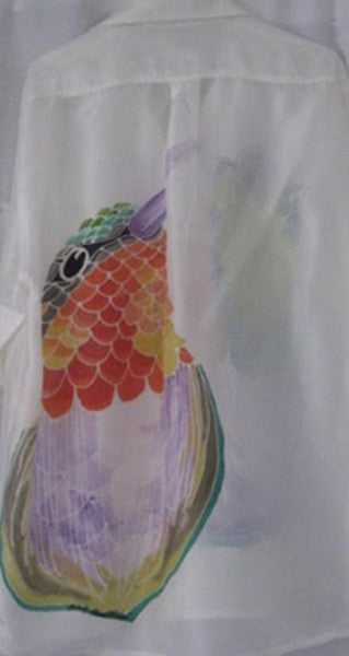 On a lighter note, I constantly experiment with colour and incorporating printmaking with my "gutta serti" process. I am presently working on the similarities of Viking armour and hummingbird feathers. Illustrating how man attempts to imitate nature, for all the right reasons, but then steals from nature to the point of extinction.