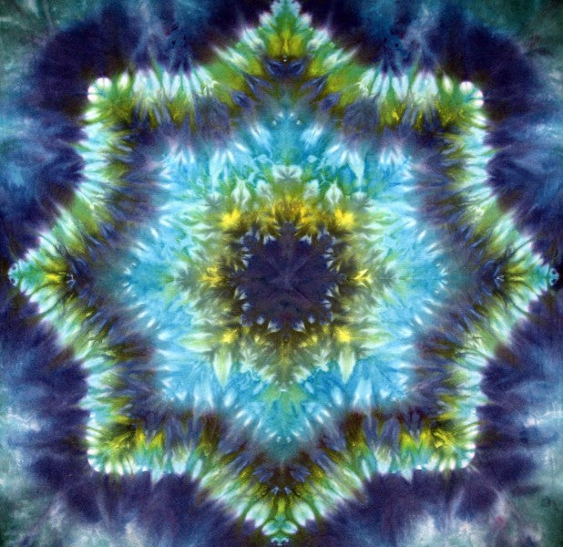 I use the traditional "tie dye" method, incorporating immersion dying (also known as the crystal technique). Combining the two methods allows you to create a basic pattern, but then enhance it with different colors, which combine in unique ways with the base colors, sometimes creating a stained glass window effect.