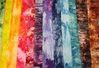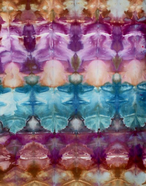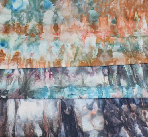 In addition to playing with ice and dye. I also love working with other ways to change the look of the fabric's surface including, but not limited to, sun printing, soy wax batik, discharge, gelatin printing, thermofax screen-printing with dye attractant and inks, and marbling. I also love using all kinds of tools for marking the fabric from potato mashers and wood printing blocks to doilies and lace.