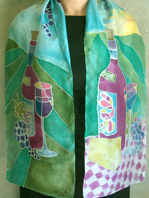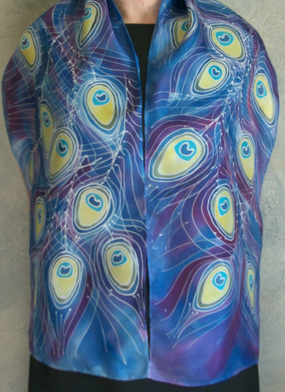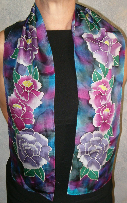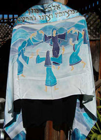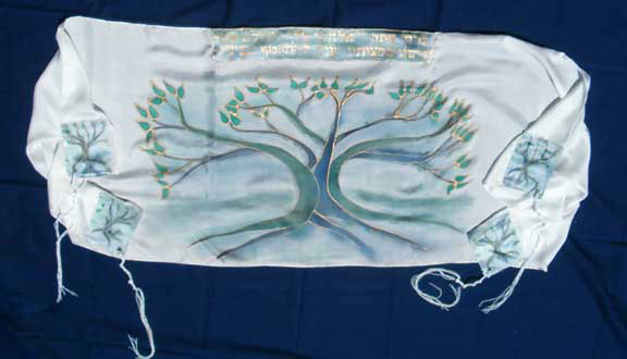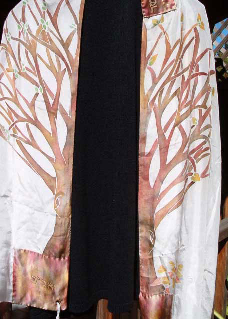 Elissa creates hand painted silk scarves, shawls, and ties in a variety of original designs, colors, and sizes. She also creates hand painted silk tallit (prayer shawls), challah covers, and matza covers. Her designs include representational images (flowers, animals, insects, plants, skylines, figures, landscapes) and geometric designs.