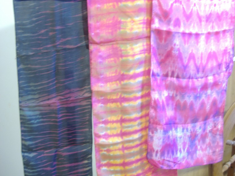 Dyed cotton for quilters, silk (dupioni, shangtung, silk/rayon velvet) for designers, tencel beach cover ups, all sorts of yarns -- I sell these out of my studio and in several local shops, by word of mouth, and in various craft shows and quilt shows.