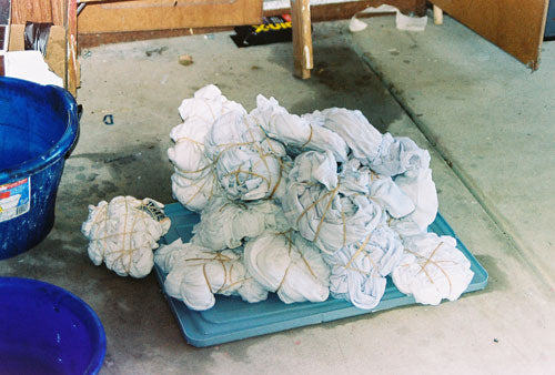 Again, trying to copy my buddies, I turned to vat dyeing, using some dangerous chemicals such as sodium hydrosulfite and lye. This killed off my parents' grass around the mock plywood table I was using and gave me chemical burns on my feet and legs when I wasn't wearing shoes. Therefore, I went back to Procion dyes, but this time I mostly did vat dyeing with lots and lots of table salt, trying to get deep rich colors along with the soda ash.