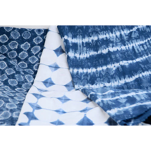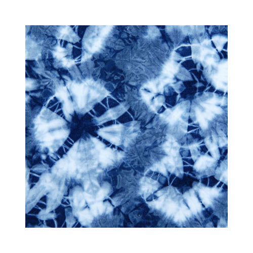 When you are ready to dye, wet your fabric and squeeze out any excess water. Skim the flower and crust off the top of the vat and set aside. Enter your wetted-out fabric slowly and manipulate under the surface of the water. You don't want to stir up the sediment at the bottom of the vat. Nicely, you get way less with this product than with natural indigo. Squeeze the fabric as you lift it out trying not to drip or make bubbles, as this introduces more oxygen into the vat. When you lift your fabric out, it will be a yellow-green color. As the air hits the fabric, the indigo will gradually oxidize and the fabric will turn blue. After 15 to 20 minutes, you can re-dip your fabric for darker shades, or rinse and un-tie (if doing tie-dye) and wash.