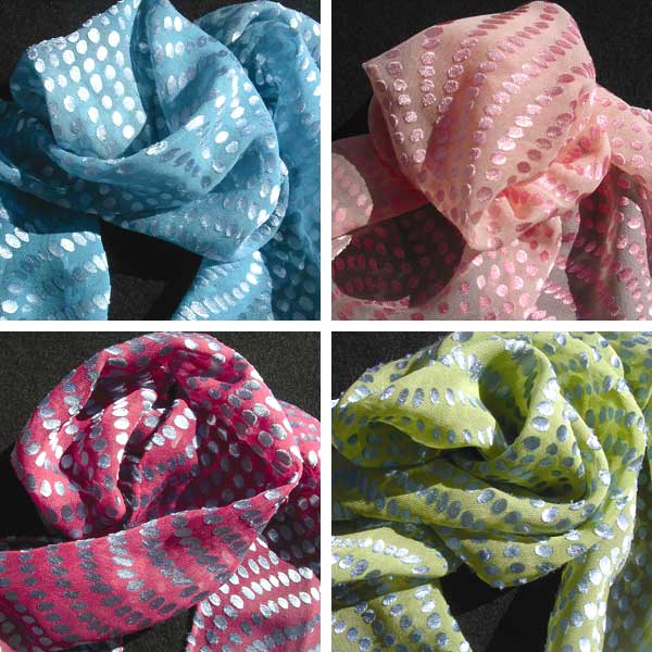 These Alter Ego Dyes, which are also sold individually in lots more colors, are tailored specifically for dyeing patterned Silk/Rayon blends, like Devore Satin or Cut Rayon Silk Velvet where the backing is silk and the pattern overlay is rayon satin or rayon velvet pile. Alter Ego dyes provide colors for the silk fibers, and colors for the rayon fibers. You choose one of each, and pour them both into the dye bath with your fabric or scarf, vinegar, salt and fixative, and shazam! beautifully dyed in the 2 colors you chose.